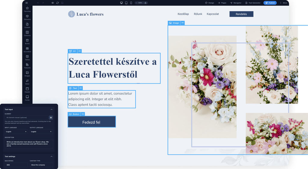Kezdd el összekattintgatni a weboldaladat. Ne feledd, szövegíráshoz használhatod az AI-t, ha pedig képekre, videókra van szükséged óriási adattárunkból szabadon választhatsz.